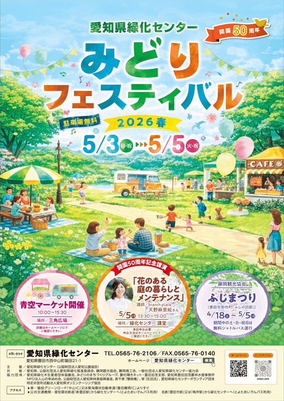 2026年5月3日(日・祝)から5月5日(火・祝)に愛知県緑化センター(愛知県豊田市)で開催される「みどりフェスティバル2026春」において、「緑の募金」にご協力いただいた方に苗木や記念品を配布します。
